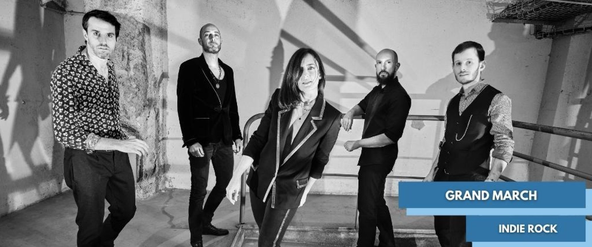 À la voix, une fille qui n’avait pas prévu d’aimer faire monter l’adrénaline sur scène. Autour, une bande de musiciens qui s’est agrandie et qui préserve l’instinct rock du groupe. Depuis 2010, Grand March balance son style élégant et mélodique et a sorti 4 disques, toujours fidèle au genre mais curieux de mélanger les styles. Aujourd’hui teintées d’accents blues et soul, les chansons du quintet continuent de raconter, sans noirceur, des histoires de rupture, de regret ou de désenchantement, mais avec une maturité qui fait sentir combien la profondeur poétique est aussi nécessaire que l’exaltation. Grand March se produit en version électrique ou acoustique et prépare son 5e album, à paraître début 2024.